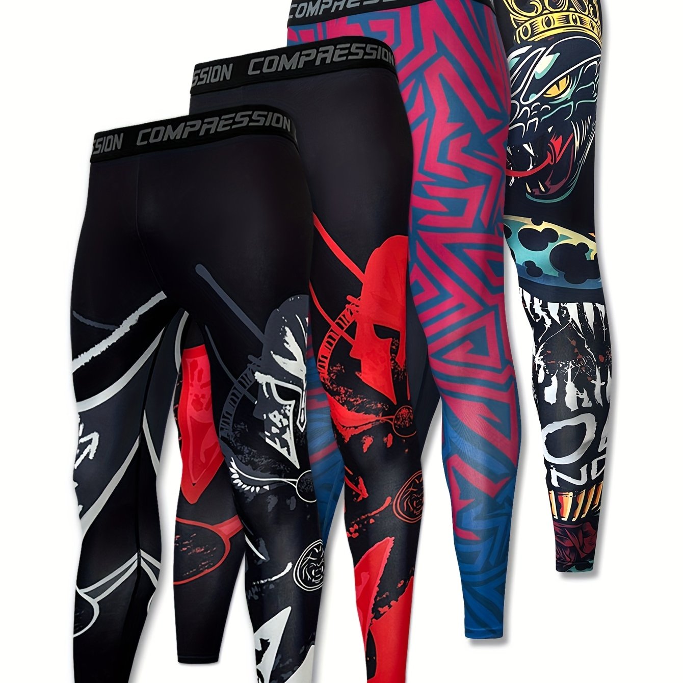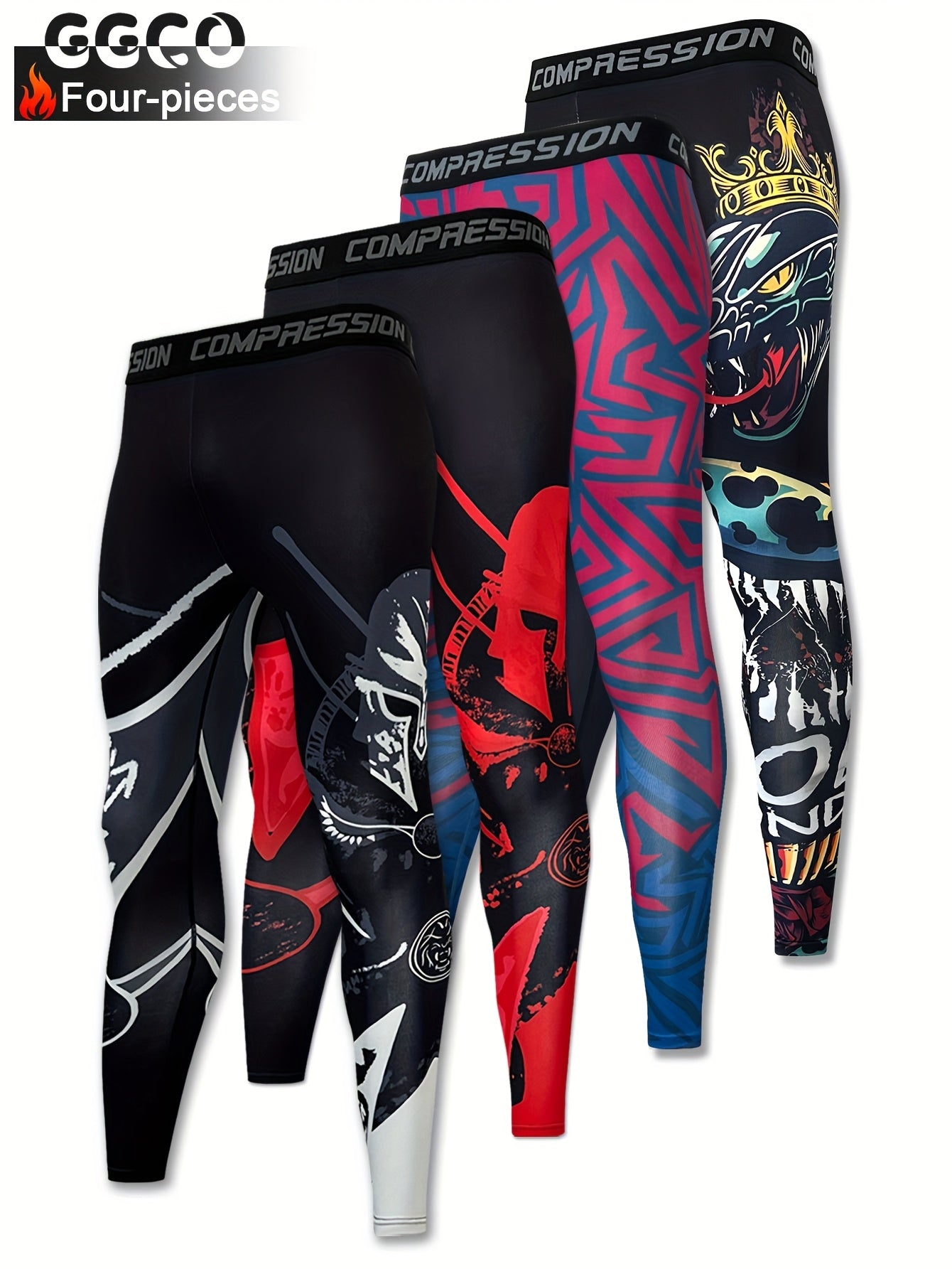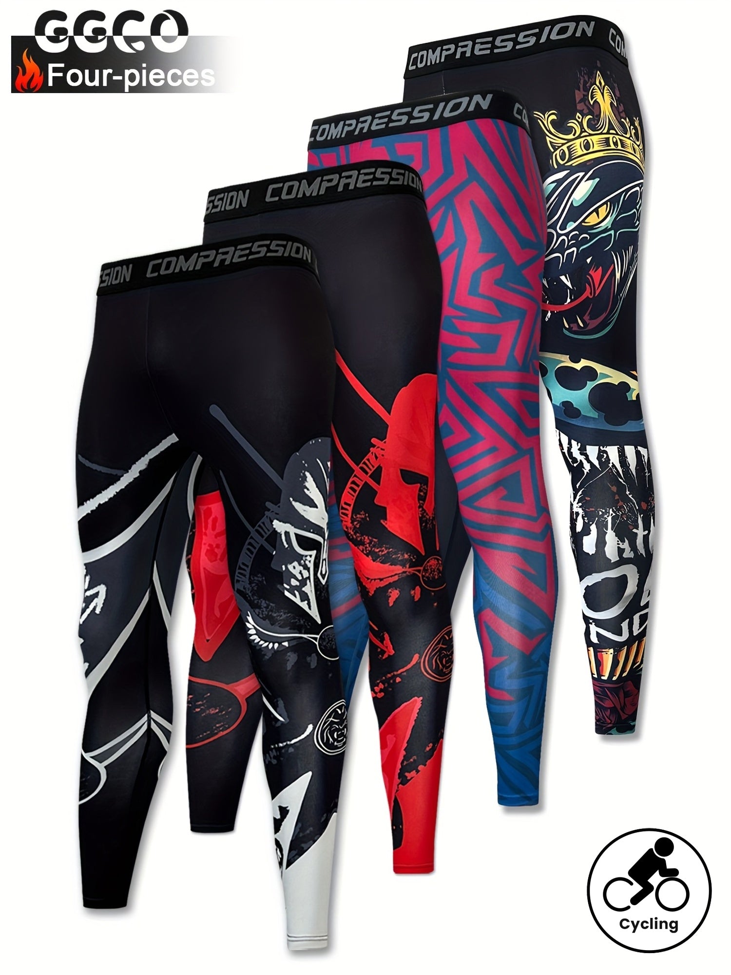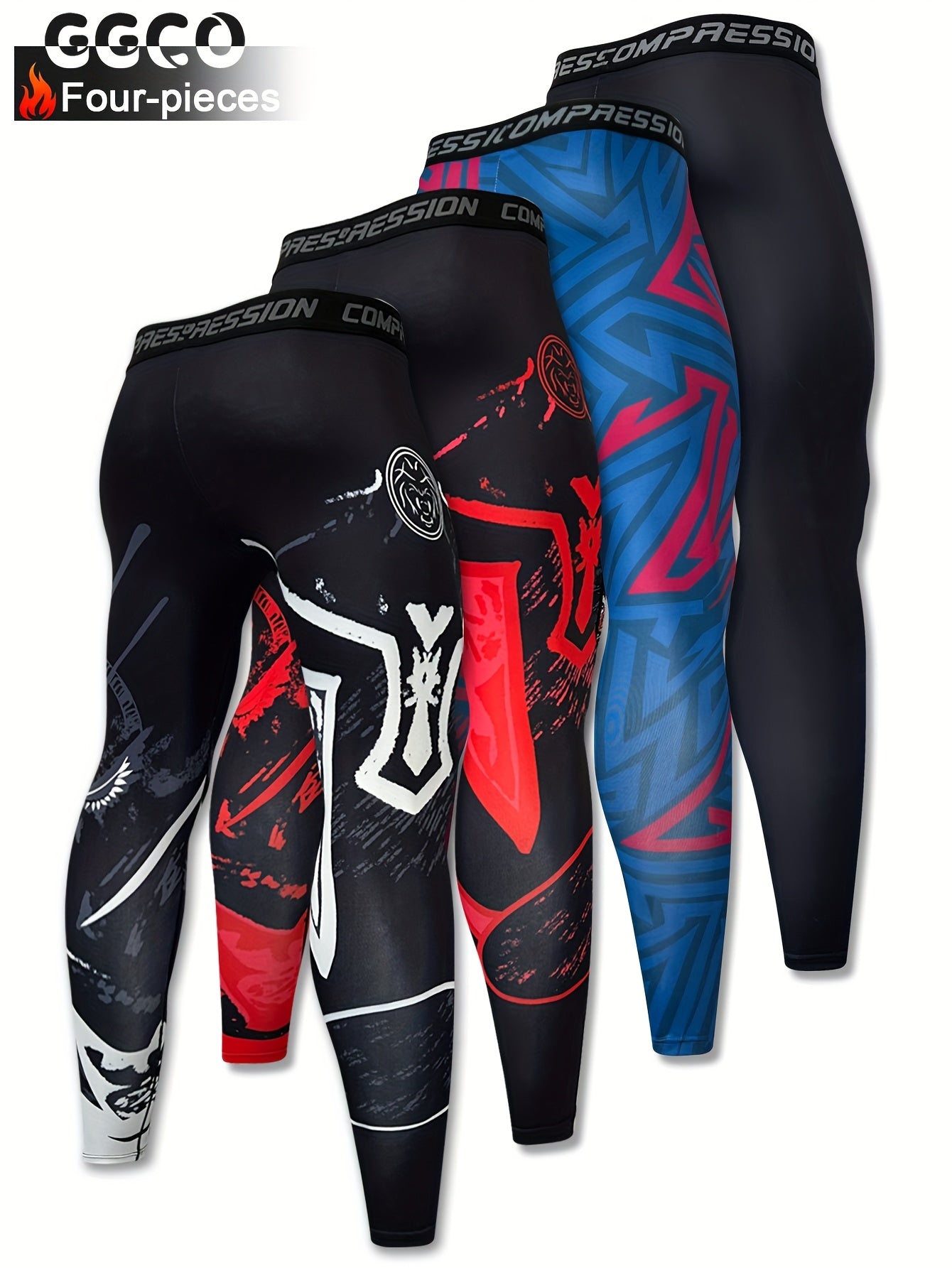 [4pcs Quick-Dry Athletic Pants] 4pcs Quick-Dry Men's Athletic Pants | Stretchy Compression Leggings for Fitness, Basketball, Running, Cycling & Outdoor Training | Vibrant Color Block Design with Bold Lettering, Compression Sp