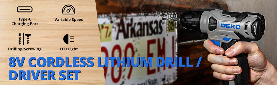 DEKO Drill Set: Tool Set with 8V Blue Cordless Drill