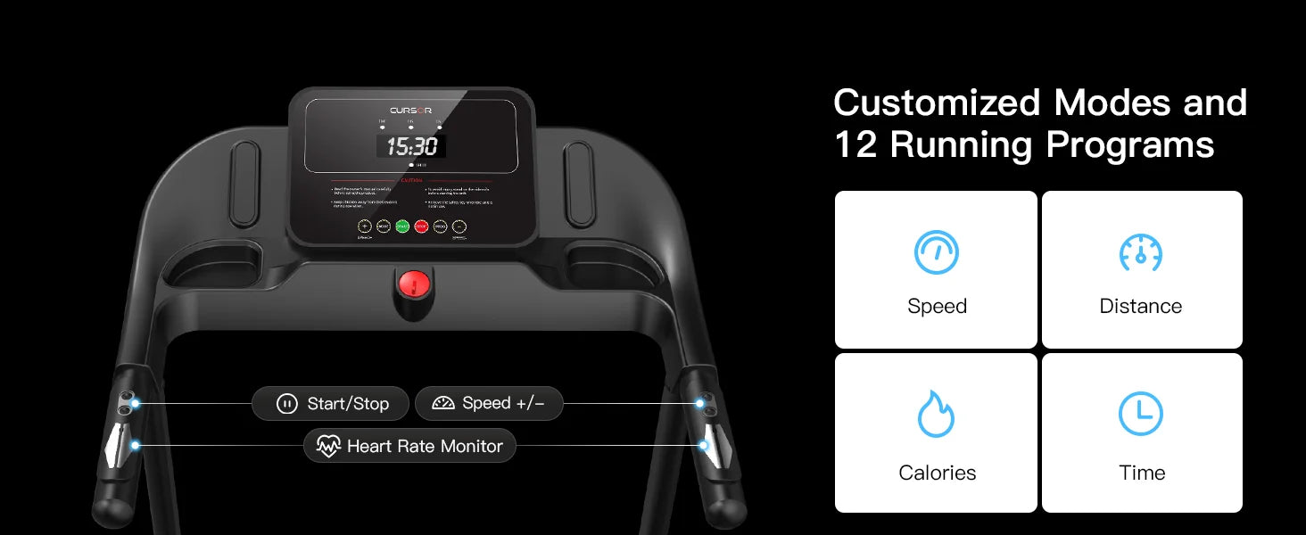 QUIET BRUSHLESS MOTOR: CURSOR FITNESS brushless motor with max 2.5 HP provides efficient, reliable, and low-maintenance operation, while providing speeds of 7.5 MPH and emitting only 40-65 dB of noise, ensuring your workouts won't disturb your downstairs or next-doors