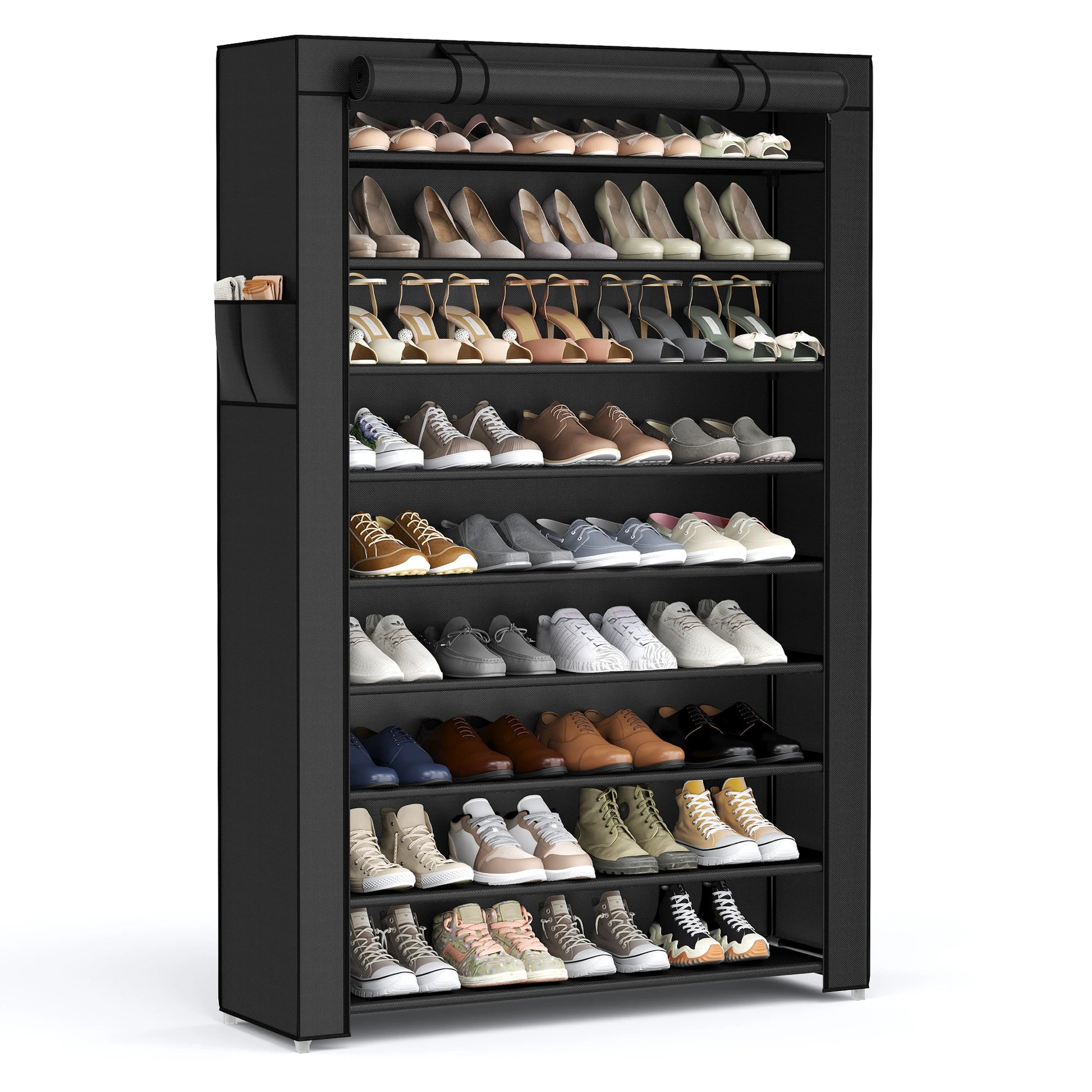 [Dustproof Cover and Water-Resistant Shelf] You can zip up the cover of this shoe storage organizer to keep dust off your shoes; the fabric tiers are water-resistant, so just wipe clean with a damp cloth if they get dirty