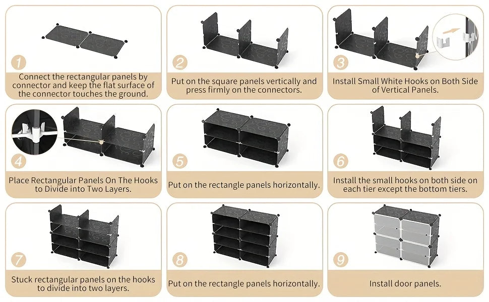 Made of high - quality materials, the panels are thickened and waterproof, effectively resisting daily wear and moisture. The upgraded connecting tubes are robust and durable. Paired with anti - separation connectors, they ensure the shoe rack is stable and won't shake, and it's not easily damaged over long - term use.