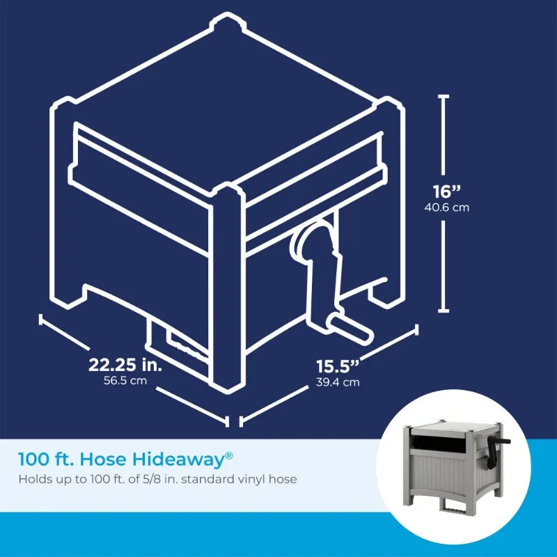 Introducing the Suncast 100 Feet Hose Hideaway Reel, a perfect blend of functionality and modern design for your gardening needs. This durable storage solution is crafted from high-quality resin, ensuring long-lasting performance and protection for your garden hose. With the ability to store up to 100 feet of 5/8-inch standard vinyl hose, this hose hideaway reel is ideal for maintaining a tidy outdoor space while keeping your hose protected from the elements.